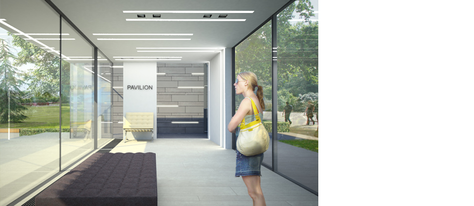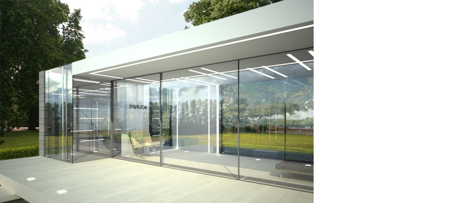 Lighting within the building is by trimless recessed ceiling luminaires which blend neatly into the clean finish of the pavilion space and recessed LED light strips continuing from the ceiling down the walls and along the floor.