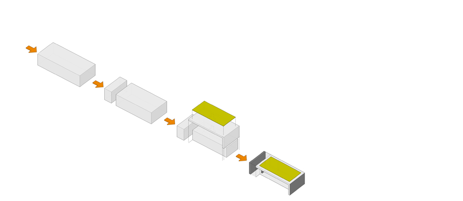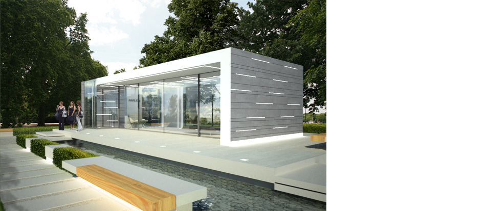 The concept of this pavilion is to create a clean open structure that appears to float on a cushion of light and can be virtually opened up so that the narrow exposition space within can spill outside.