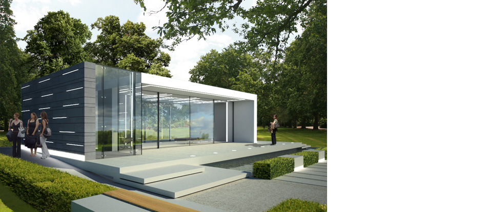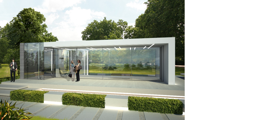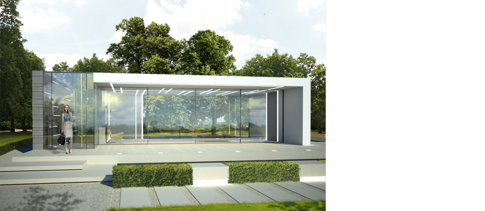 The entrance to the pavilion is through a glazed box which flows into the pavilion space where the floor-to-ceiling glazing breaks down the distinction between inside and outside.